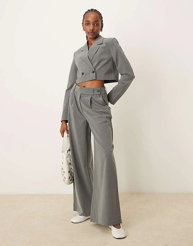 Pimkie Cropped Tailored Blazer And Wide Leg Tailored Trousers Co-ord In Grey Pinstripe